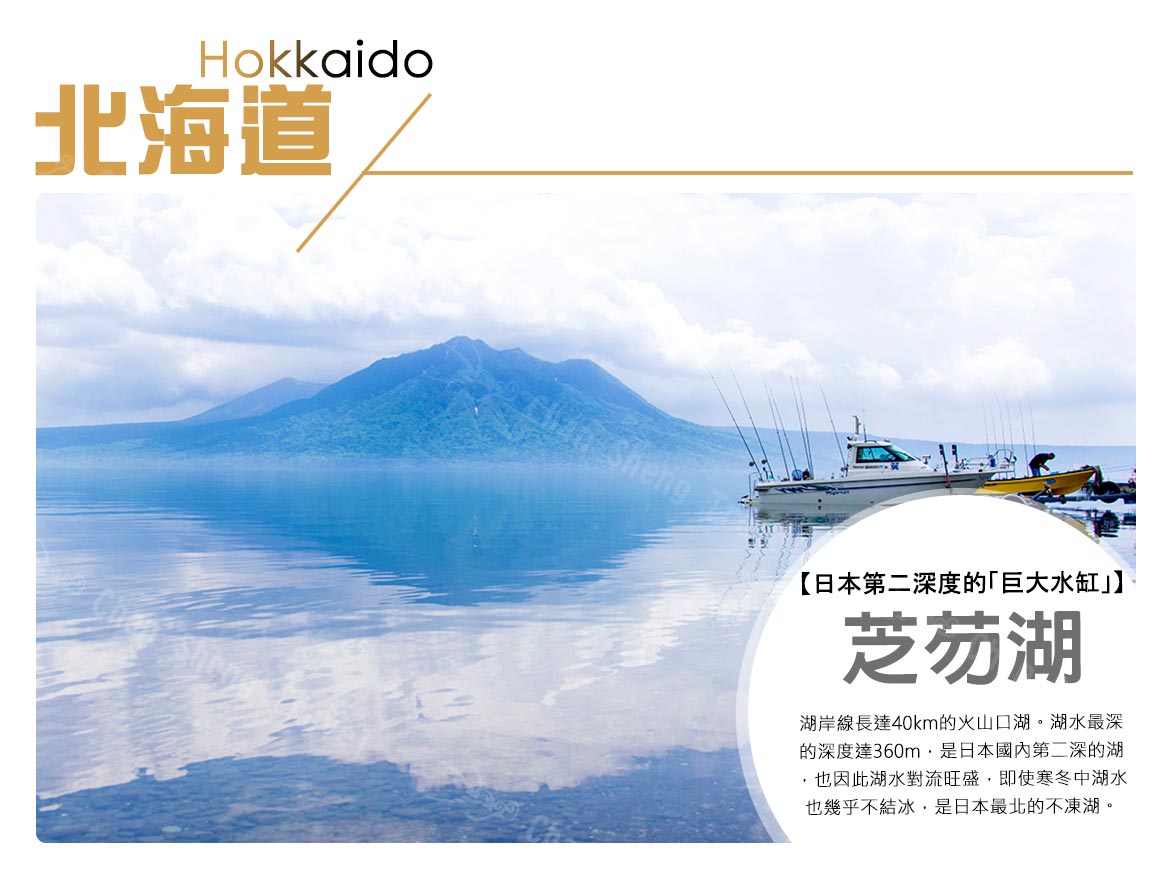 【支笏湖國立公園】支芴湖是日本僅次於田澤湖之第二深的美麗湖泊,是一個約在3萬2千年前因為火山爆發,直到9千年前左右才形成的火山口湖。四周約有42公里,最大深度為363公尺,透明度達25.3公尺,平均最高水溫只有3.6度,同時亦為眾所皆知日本水溫最低且最北方的不凍湖。