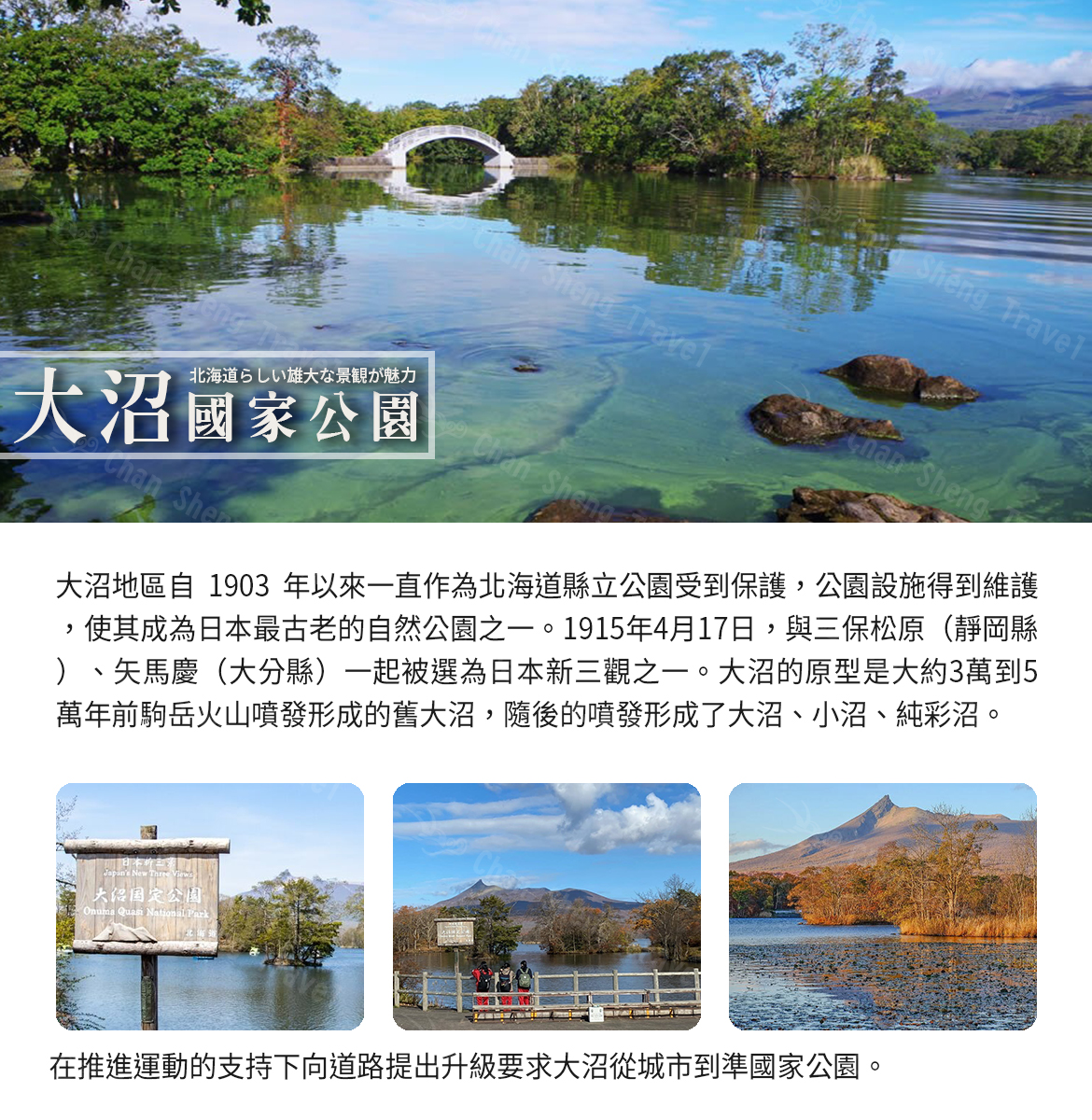 【大小沼國定公園】距離函館30公里,此為道南唯一的國定公園,也是新日本三景之一,素有北國的輕井澤之稱。美景天成的大小沼國立公園,湖畔林木美輪美奐,大沼和小沼兩湖之間以【月見橋】相連,秀峰駒岳倒映湖面美不勝收。