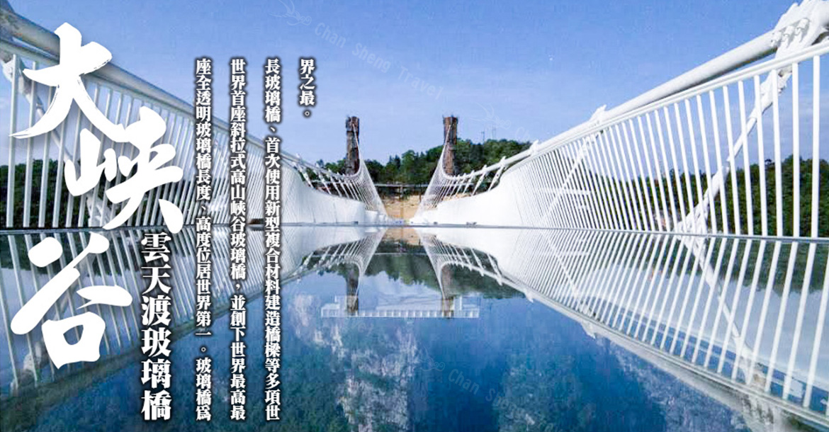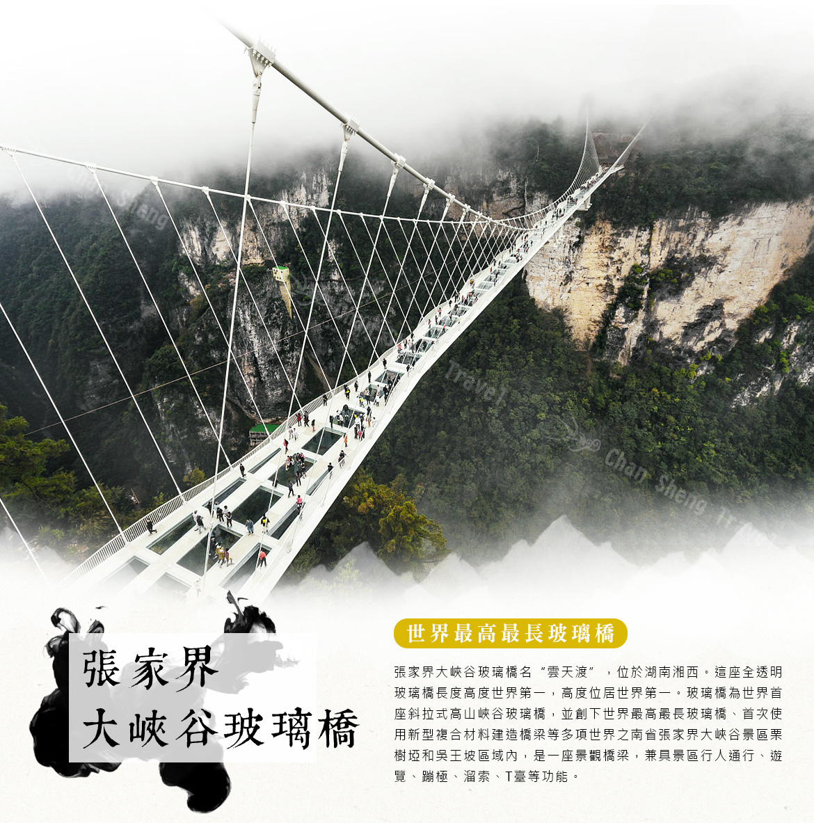 【雲天渡玻璃橋】張家界大峽谷玻璃橋,又叫“雲天渡”,號稱世界上只有1%的人才敢過的橋,是一座全透明玻璃的玻璃橋。它主跨430米,一跨過峽谷,橋面長375米,寬6米,橋面距谷底相對高度約300米。其高度居世界第一,也是世界首座斜拉式高山峽谷玻璃橋,並創下世界最高最長玻璃橋、首次使用新型複合材料建造橋樑等多項世界之最。 CNN將其列入世界上11座壯觀的橋之一。