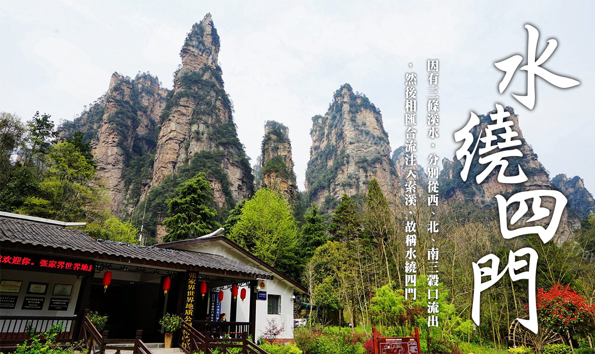 【水繞四門】地處武陵源中心,由金鞭溪、索溪、鴛鴦溪、龍尾溪四條溪流在這塊不足 200 平方米的山谷盆地裏盤繞匯流。感受大自然的美妙之處。