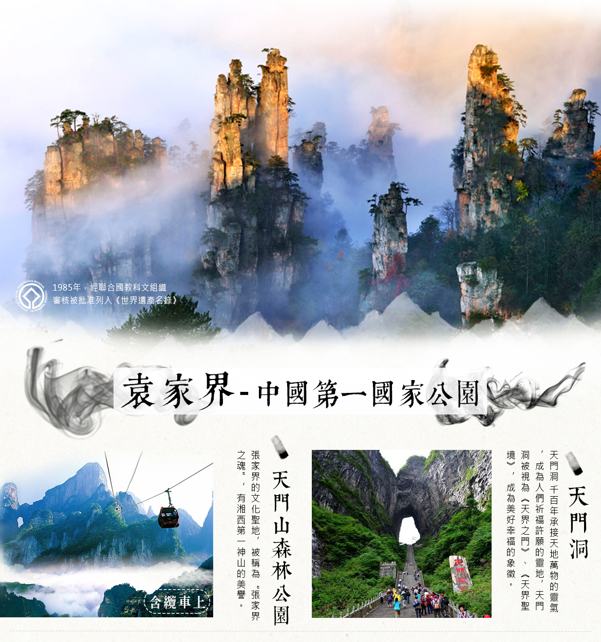 今早集合於桃園國際機場,由親切的服務人員協助辦理登機手續,後搭乘豪華客機飛往香港轉機前往阿凡達的拍攝地—仙境張家界。抵達後隨即前往享用豐盛晚餐,餐後返回酒店休息!19829月,張家界成為中國第一個國家森林公園;19888月,武陵源被列入國家第二批40處重點風景名勝區之內;1992年,由張家界國家森林公園、索溪峪風景區、天子山風景區三大景區構成的武陵源自然風景區被聯合國教科文組織列入《世界自然遺產名錄》。19829月,張家界成為中國第一個國家森林公園;19888月,武陵源被列入國家第二批40處重點風景名勝區之內;1992年,由張家界國家森林公園、索溪峪風景區、天子山風景區三大景區構成的武陵源自然風景區被聯合國教科文組織列入《世界自然遺產名錄》。