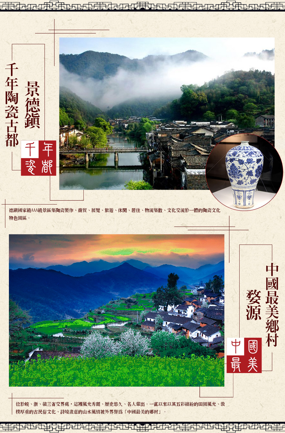 【婺源】為「最美的鄉村」,也有人說它是「最後的香格里拉」,擁有許多保存良好的古村落,與青山綠水、粉牆黛瓦、飛簷翹角,構成一幅幅恬靜自如、天人合一的畫卷。