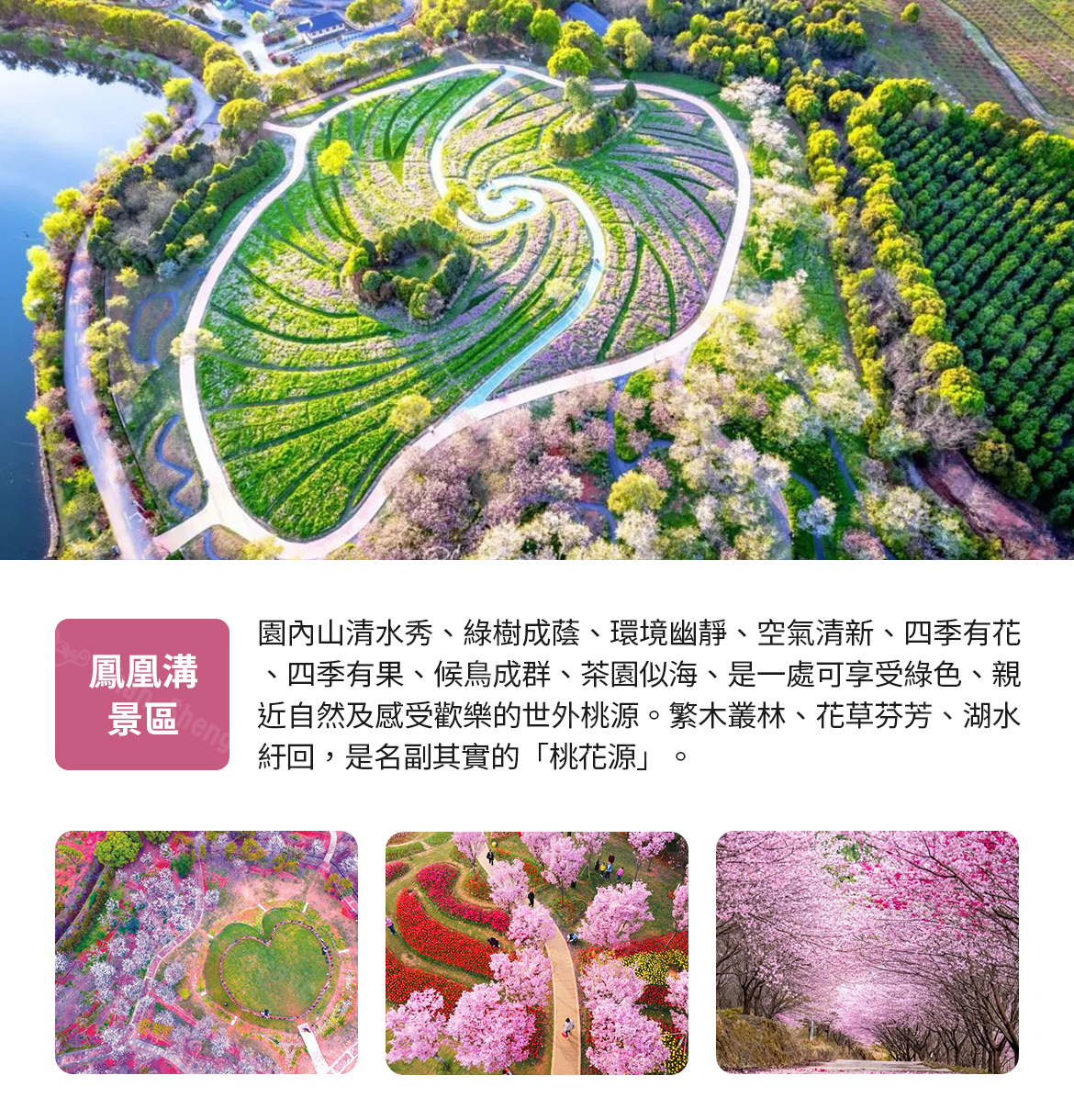 【鳳凰溝景區】為一座集「生態模式、科技示範、品種展示、幹部培訓、農業體驗、休閒觀光與娛樂」為一體的休閒農業與鄉村旅遊景區。園區內山清水秀、綠樹成蔭、環境幽靜、空氣清新、四季有花、四季有果、候鳥成群、茶園似海、是一處可享受綠色、親近自然及感受歡樂的世外桃源。秋季有芬芳四溢的桂花,火紅的楓林,金黃的銀杏林等;繁木叢林、花草芬芳、湖水紆回,是名副其實的「桃花源」。