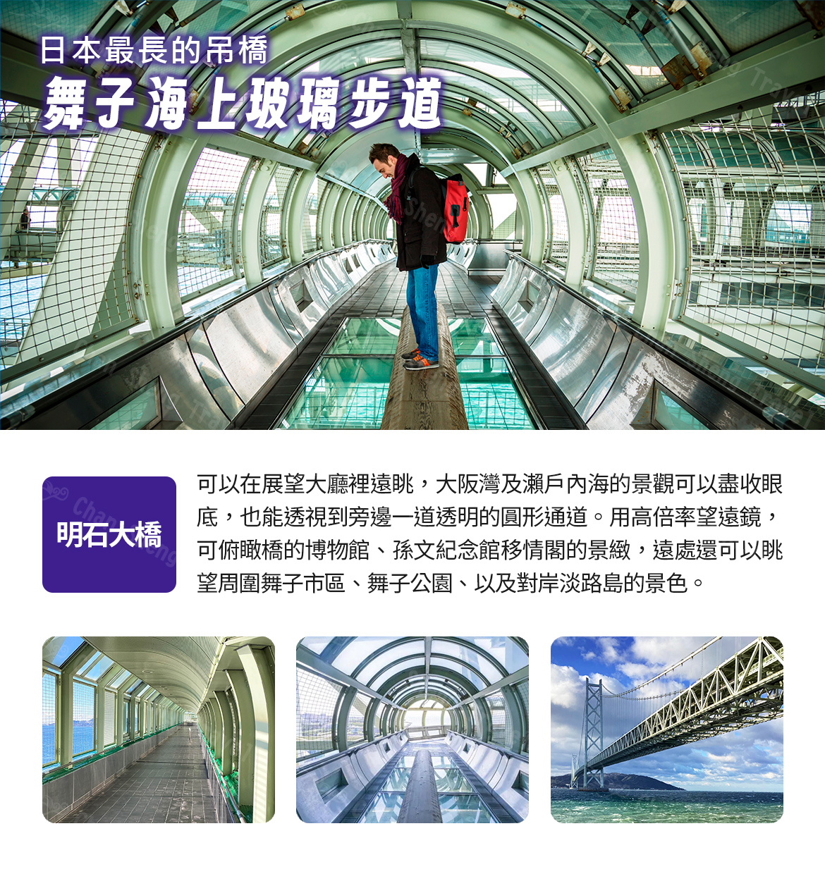 【明石大橋】全長三九一一公尺長,當時設計工程時全長為3910公尺,因1995年阪神大地震時地層變動,導致延長了一公尺,將帶領各位貴賓登上明石大橋墩,讓您與明石大橋更接近,可見橋樑當時建設時的艱難及壯觀,美景盡收眼底,一份莫名的感動湧上心頭!可以在展望大廳裡遠眺,大阪灣及瀨戶內海的景觀可以盡收眼底,也能透視到旁邊一道透明的圓形通道。用展望大廳裡的高倍率望遠鏡,可俯瞰橋的博物館、孫文紀念館移情閣的景緻,遠處還可以眺望周圍舞子市區、舞子公園、以及對岸淡路島的景色。
