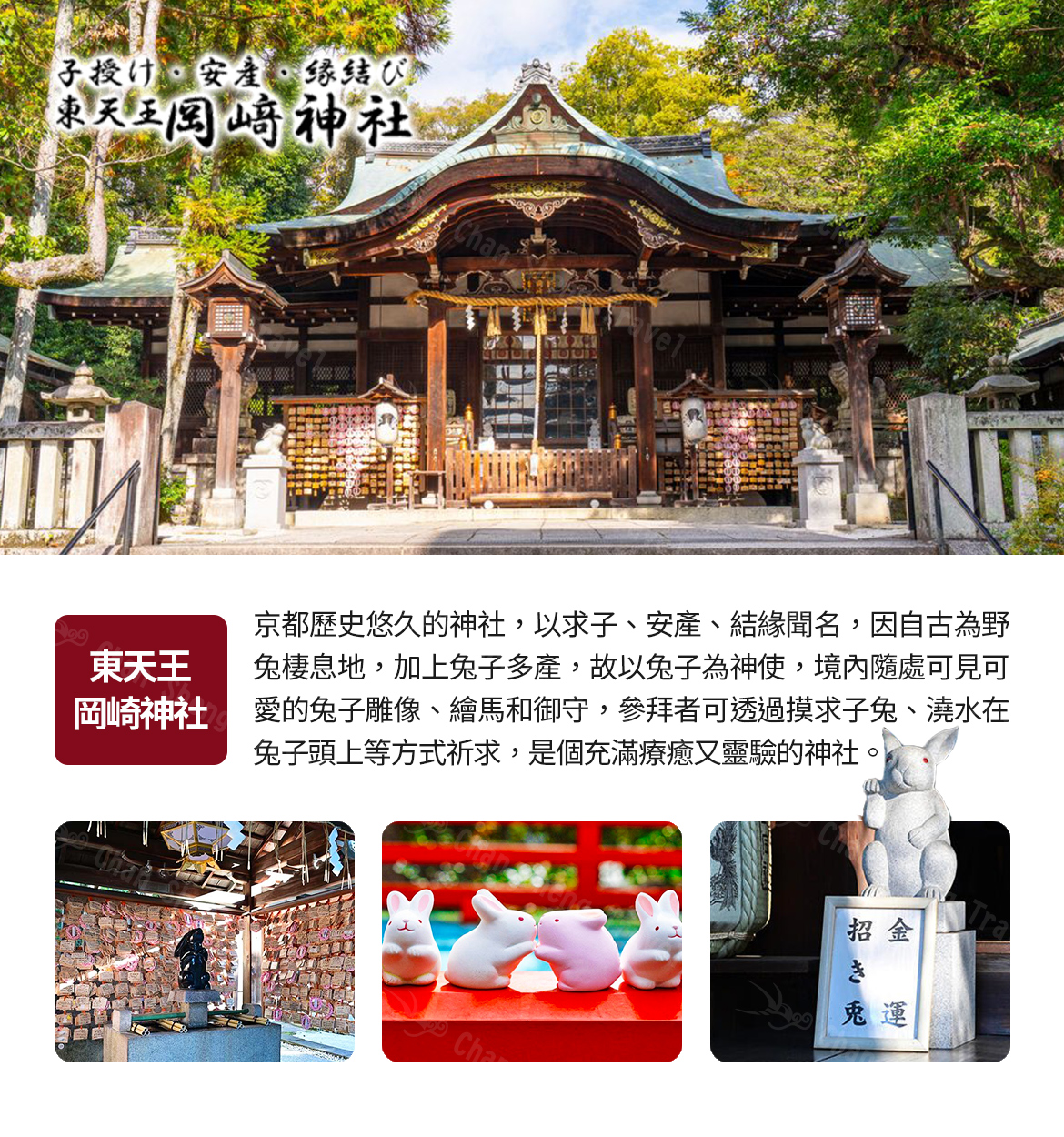【東天王岡崎神社(兔子神社) 】日本有許多祭拜動物的神社,祭祀狐狸的稻荷神社更是遍佈日本各地。但在京都「東天王 岡崎神社」,別名又稱「兔子神社(うさぎ神社)」一間充滿是可愛白兔的神社。「岡崎神社」位於京都市左京區,鄰近平安神宮、南禪寺及永觀堂,許多京都人會特別來到這裡祈願,以姻緣、求子、安產等祈願非常靈驗而知名的神社。