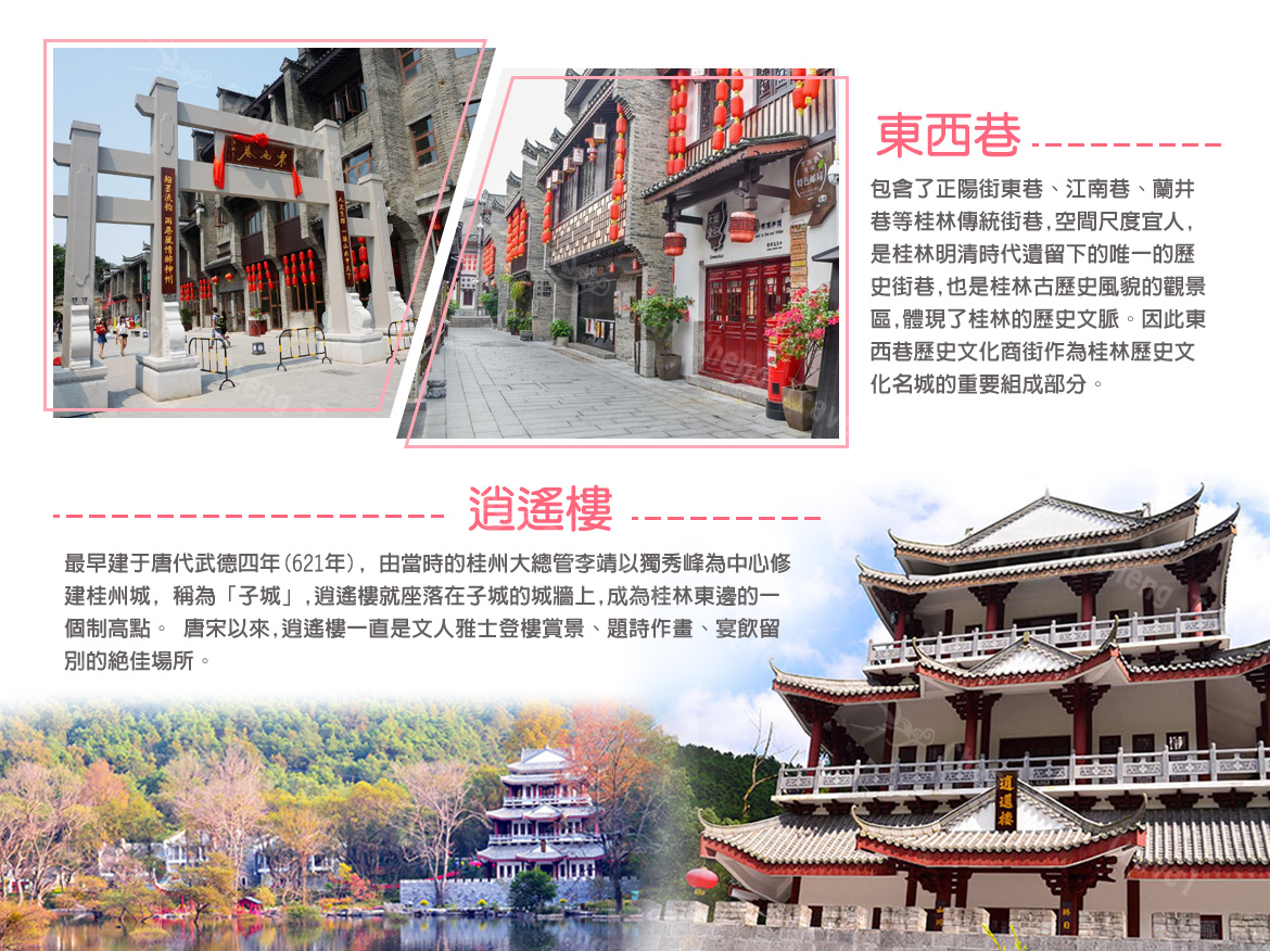 【桂林】地處南嶺山脈西南部桂東北山地區,湘桂走廊南端,北部為越城嶺,東部為海洋山、都龐嶺,西部為天平山。主要為丘陵地貌,中部為典型的岩溶峰林區。灕江、湘江為境內兩大河流,中間有靈渠相連,市人民政府駐臨桂區西城中路 69 號。桂林是首批國家歷史文化名城、中國優秀旅遊城市,其山水之景聞名天下,素有「桂林山水甲天下」之名譽。