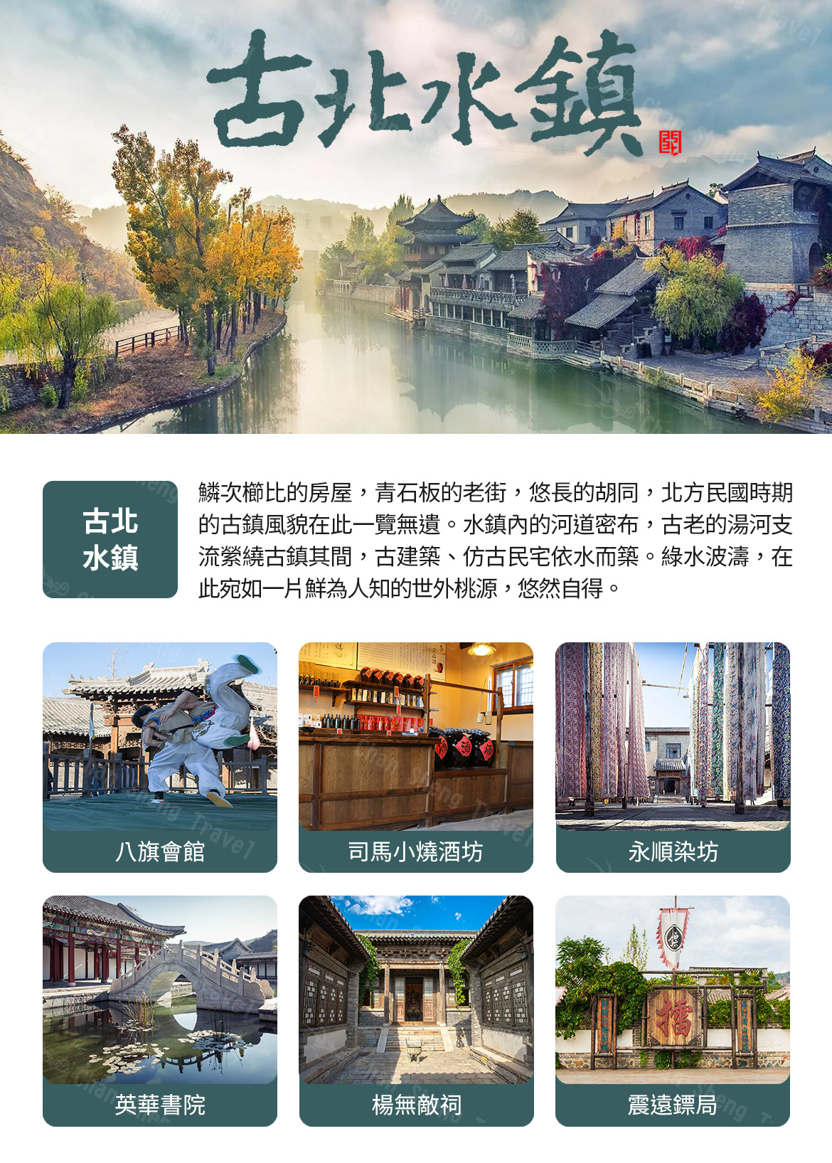 鱗次櫛比的房屋,青石板的老街,悠長的胡同,北方民國時期的古鎮風貌在此一覽無遺。水鎮內的河道密布,古老的湯河支流縈繞古鎮其間,古建築、仿古民宅依水而築,在有別於庸碌的北京市區外、倘若藍天白雲、綠水波濤、參天的白楊掩映之下,在此宛如一片鮮為人知的世外桃源,悠然自得。