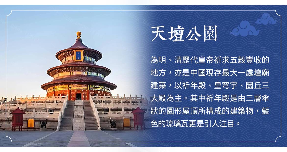 為明、清歷代皇帝祈求五穀豐收的地方,亦是中國現存最大一處壇廟建築,以祈年殿、皇穹宇、圜丘三大殿為主。其中祈年殿是由三層傘狀的圓形屋頂所構成的建築物,藍色的琉璃瓦更是引人注目。