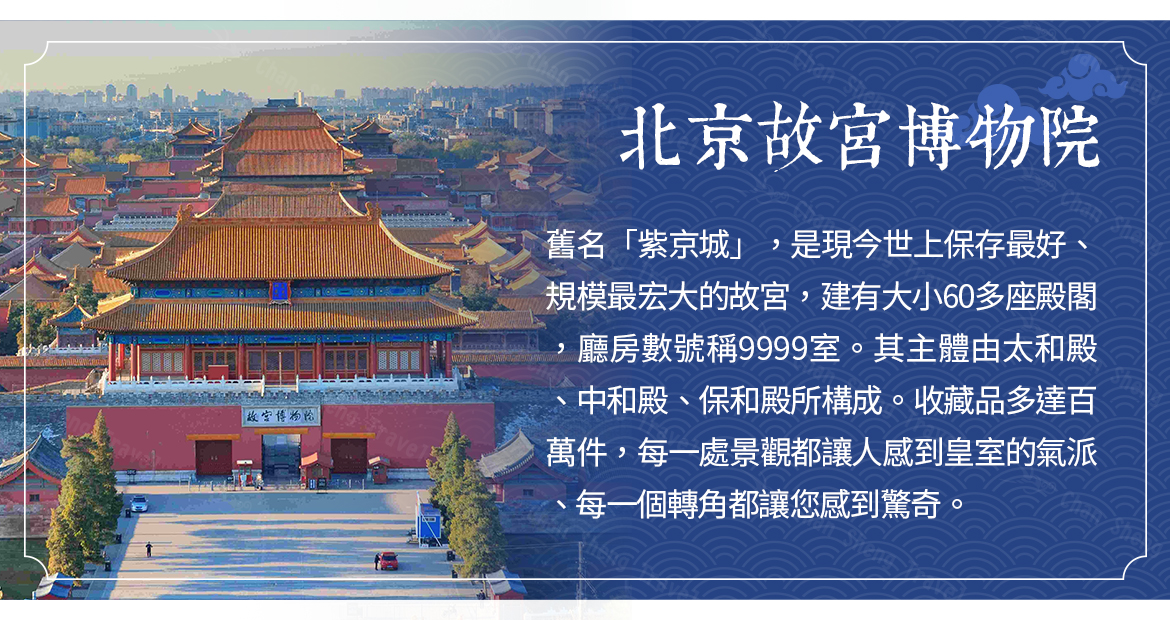 稱為紫禁城,是保存中國文物珍品及古蹟之地,也是聯合國教科文組織所認定的也界文化遺產之一。是現今世界上保存最好、規模最大的,其主體是由太和殿、中和殿、保和殿所構成;規模宏大的故宮,建有大小六十多座的殿閣,廳房數號稱九千九百九十九室,收藏品多達百萬件,每一處景觀都讓人感到皇室的氣派、每一個轉角都讓您感到驚奇。