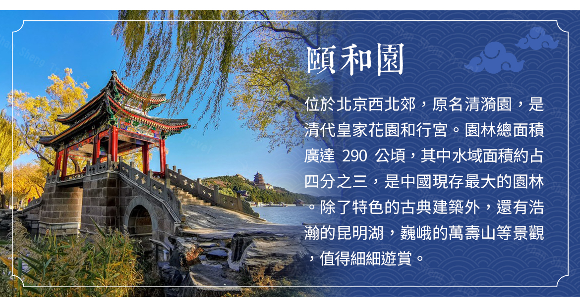 是清朝的行宮和大型皇家園林。修建於清朝乾隆年間、重建於光緒年間,曾屬於清朝北京西郊三山五園之一。頤和園素以人工建築與自然山水巧妙結合的造園手法著稱於世,是中國園林藝術頂峰時期的代表。1998年被評為世界文化遺產。頤和園是清朝三山五園中保存狀況最好的一座,也是清朝,乃至中國帝制社會史上最後修建的一座超大型皇家園囿。此外,頤和園還是自漢武帝建章宮首創「一池三山」模式以來,最後一座、以及僅存的一座保留著這種模式的宮苑。凡舉中國造園藝術中的山水規劃、借景、驀擬、對景等手段,都在頤和園中得到體現,其氣魄之壯麗甚至超過了平地起造的圓明園和山地構築的靜宜園,成為中國古典園林的登峰造極之作。