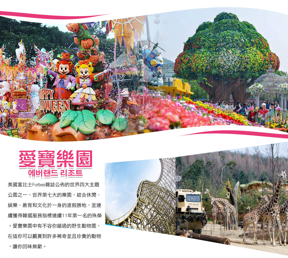 【世界第七大〜愛寶樂園】 佔地面積達450萬多坪的愛寶樂園位於京畿道龍仁市,是結合休閒、娛樂、教育和文化於一身的主題樂園,主要由環球市集、美洲探險、魔術天地、歐洲探險及野生動物園共5種主題園區所組成。