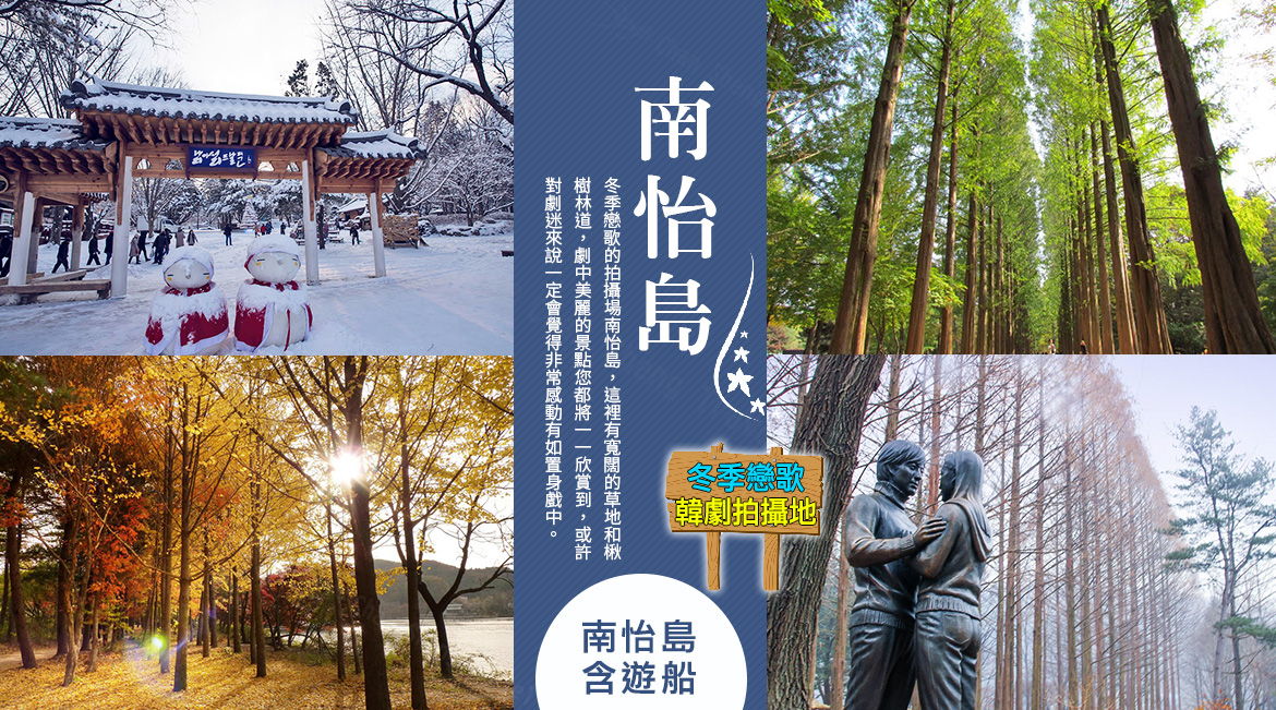 【經典韓劇“冬季戀歌”拍攝地~南怡島】(遊船、杉林步道) 坐落於春川市南山面北漢江流域的南怡島,為韓國知名主題旅遊區之一,南怡島是一個自然生態文化空間,島上以「童話國度,歌曲之島」為概念,定期舉辦各種音樂會與展覽,為小朋友帶來夢想與希望,為情侶帶來愛與回憶,為文化界人士帶來創作的土壤與舞臺。