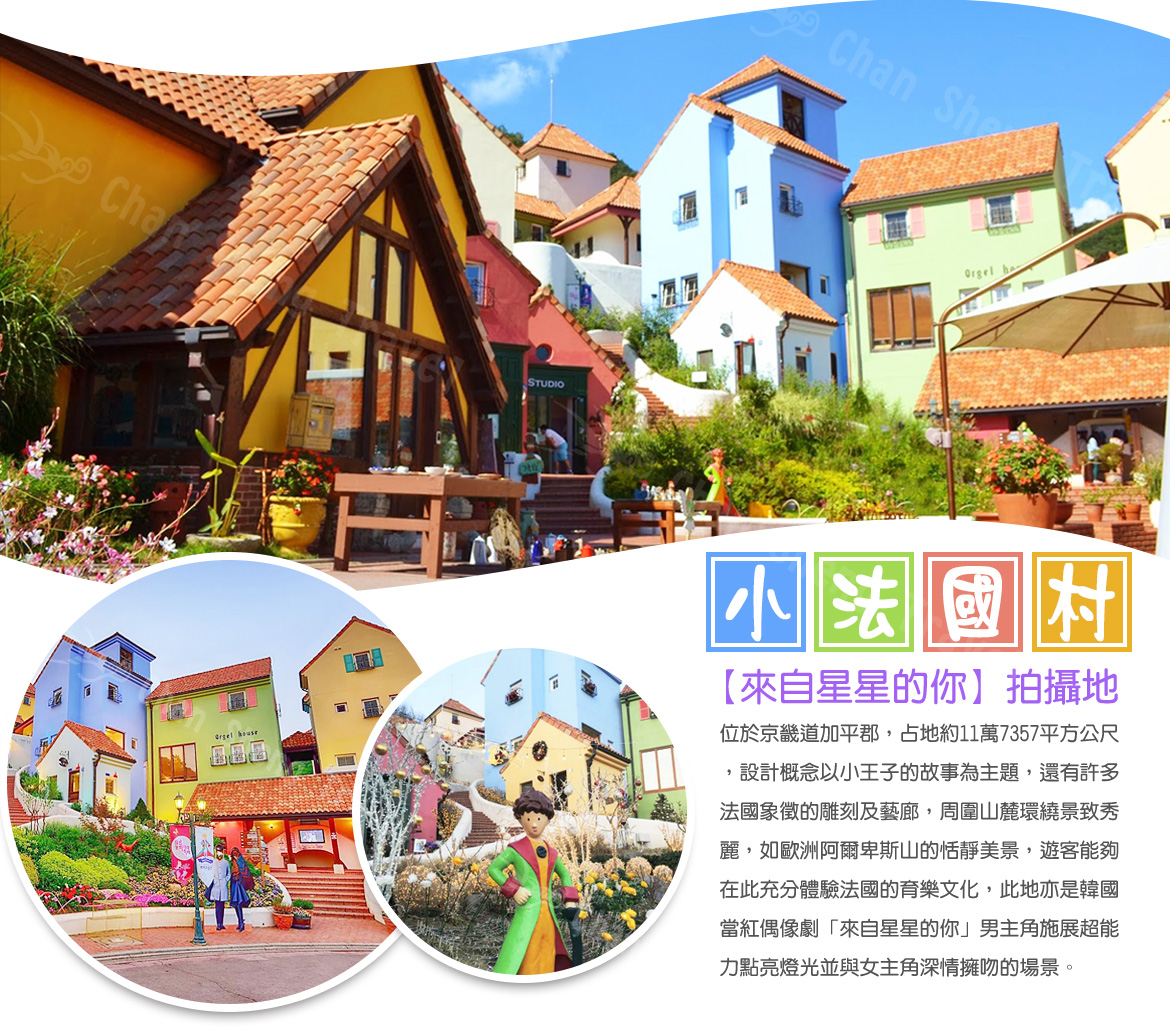 【法國村】《韓劇~來自星星的你》在15集中,都敏俊利用自己的超能力,將周邊原本黑暗的燈全部點亮,強勢的讓頌伊飛到他懷中並親吻她的浪漫場景,就是在這充滿異國風情的「小法國村」。這裏主要以法國聖埃克蘇佩里的童話《小王子》為主題。村內童話中的人物和動物造型隨處可見,